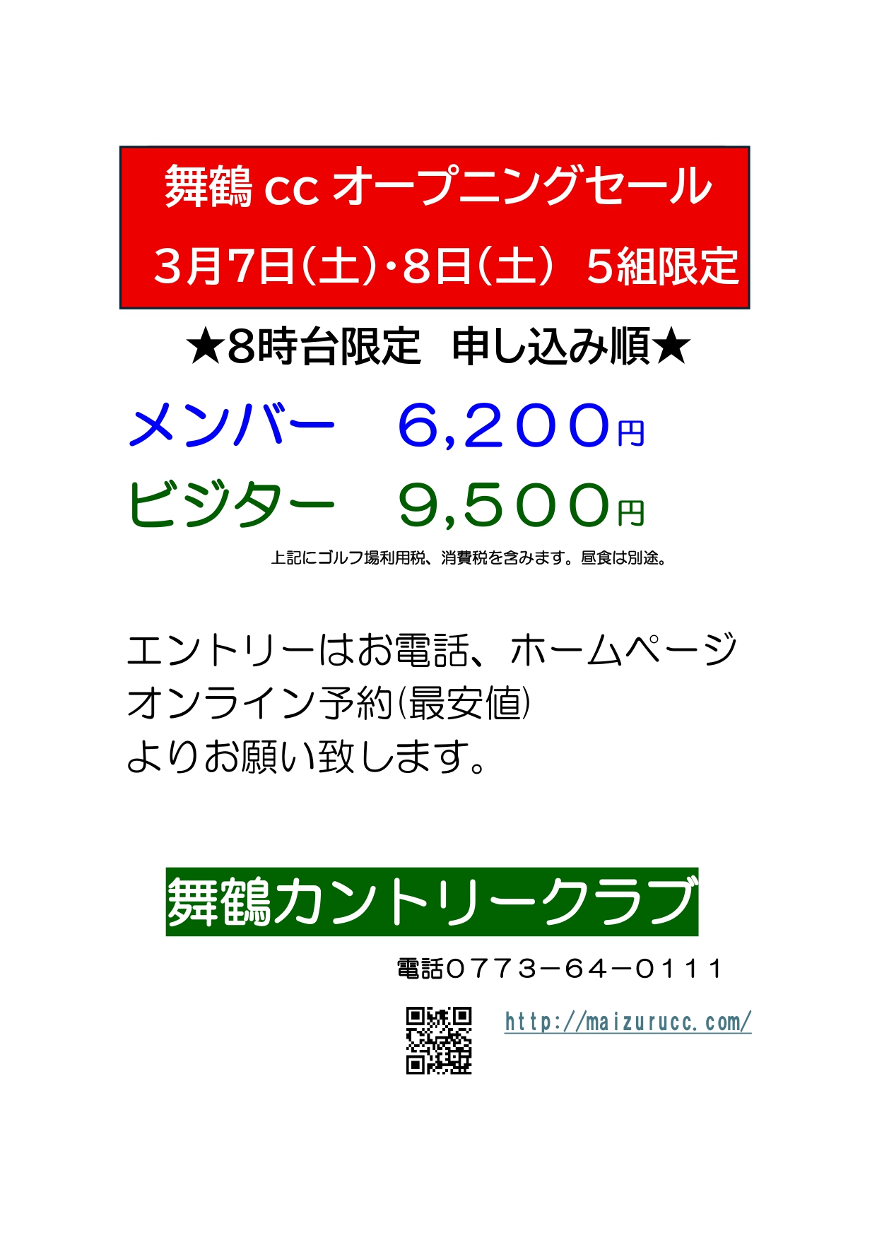 舞鶴cc オープニングセール 3月7日(土)8日(日)8時台スタート5組限定セール