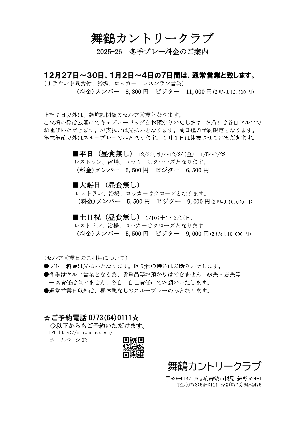 2025‐2026年 冬季営業のご案内